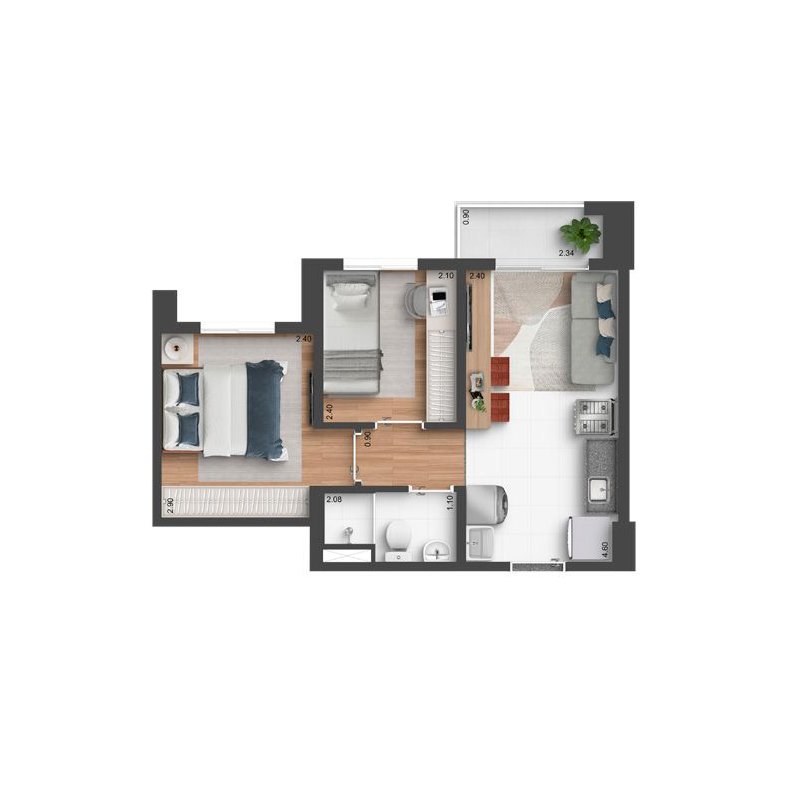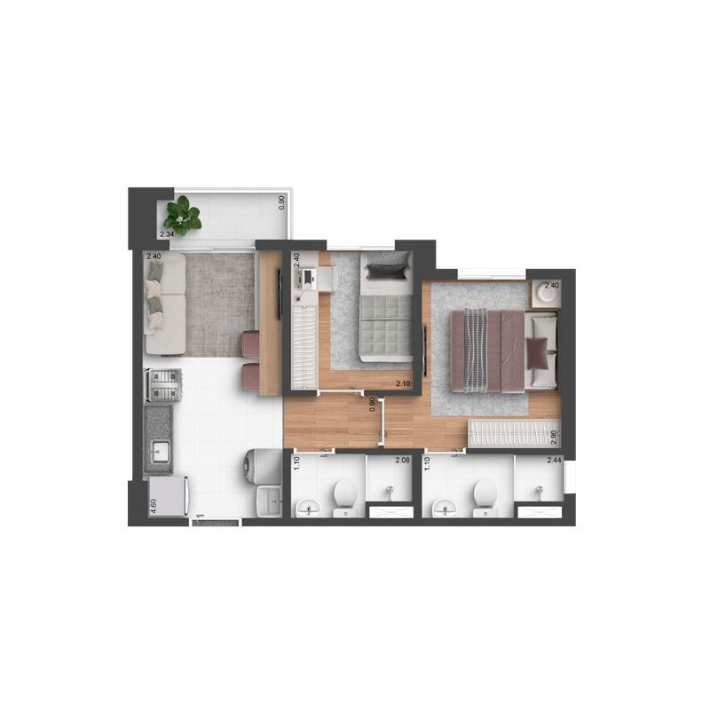 Os apartamentos tem as seguintes opçoes de dormitórios: 1, 2.