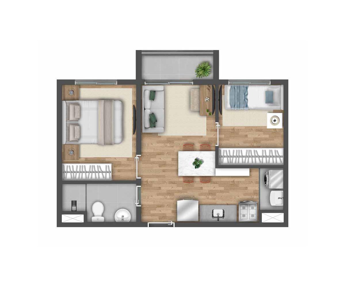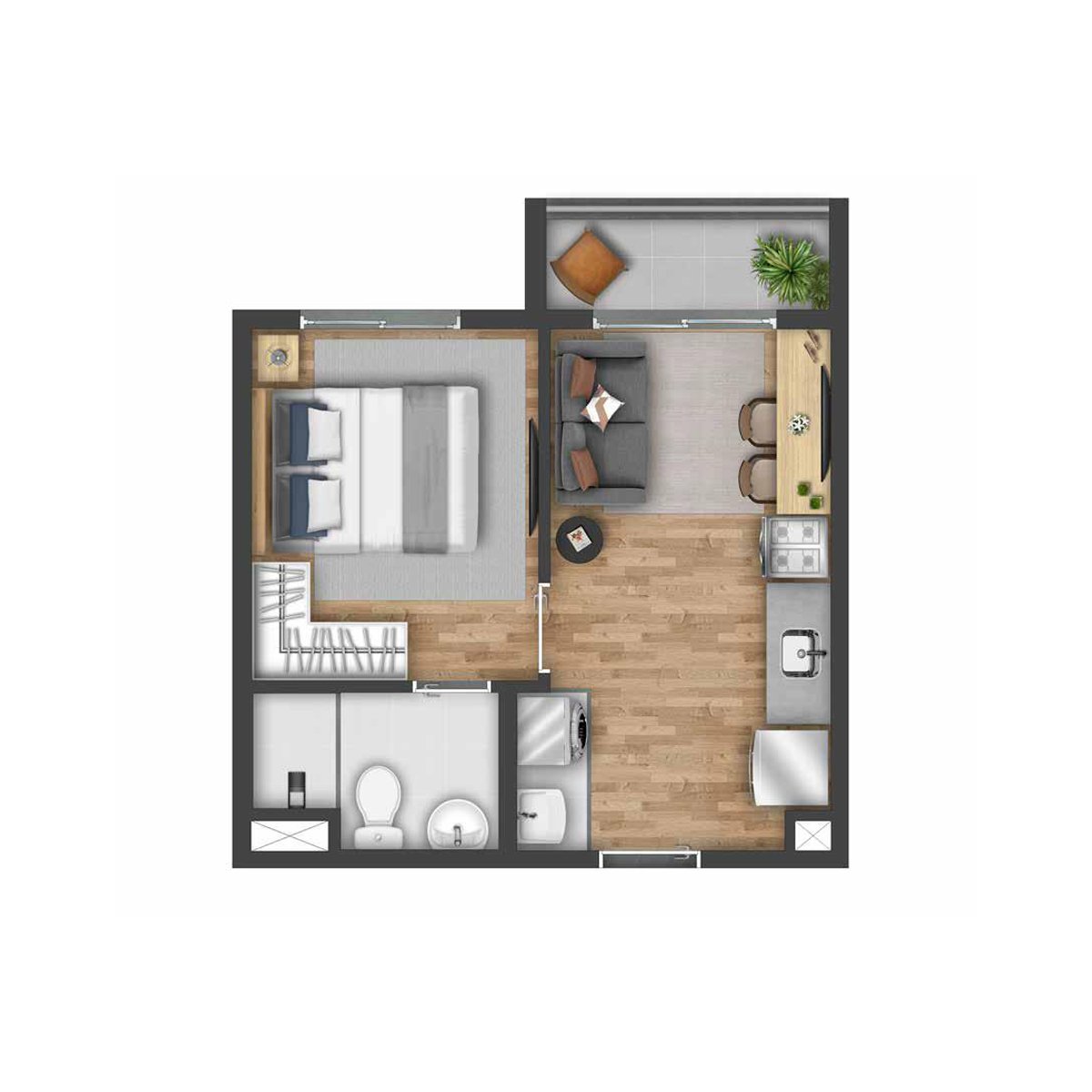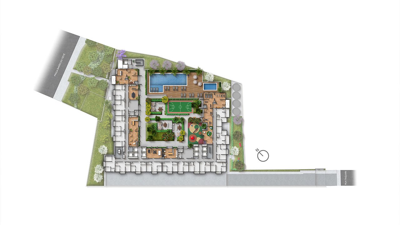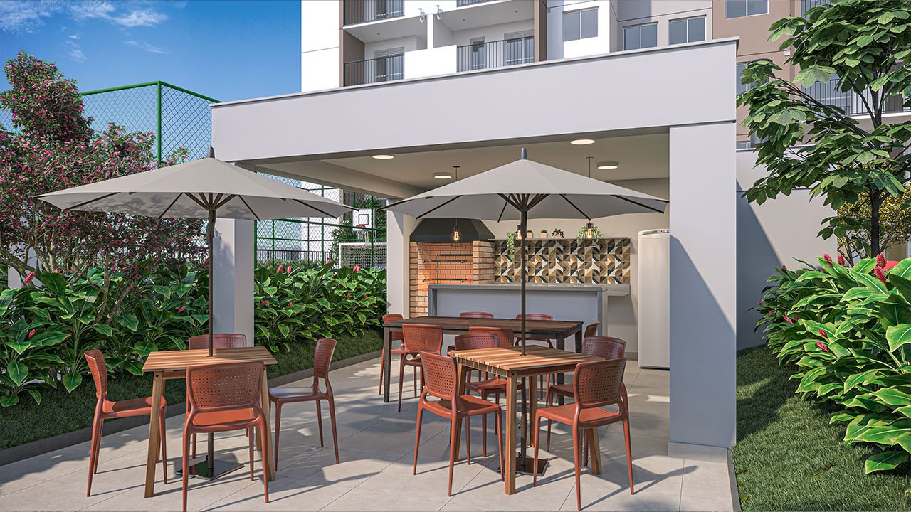 Um condomínio com apartamentos de 1 e 2 dormitórios, em plantas de 26m² à 44m². Mais de 15 itens de lazer para toda a família.