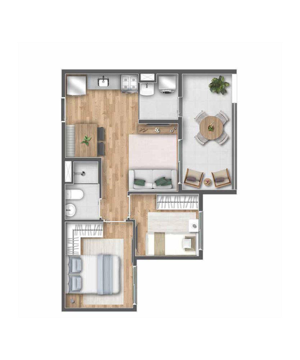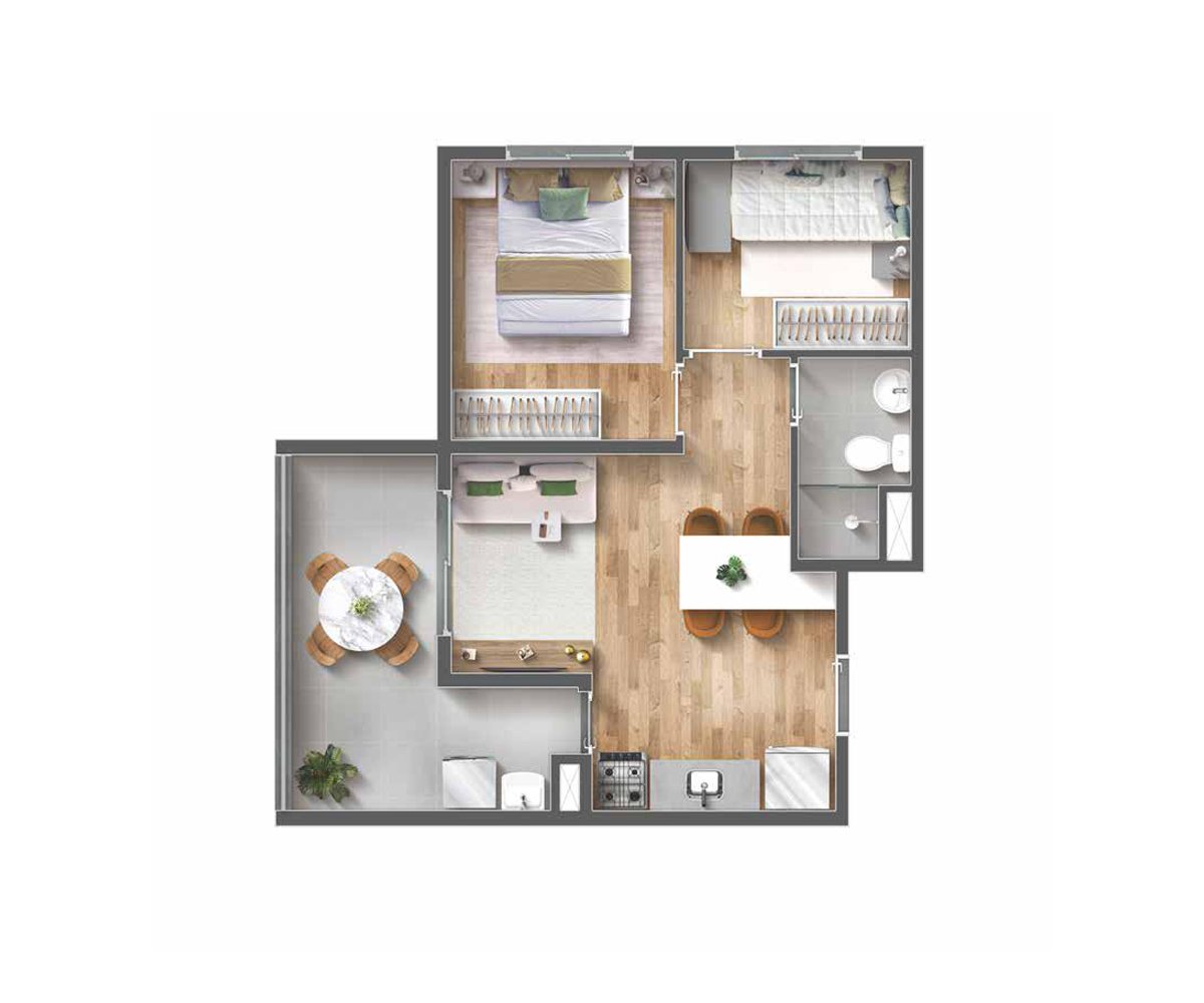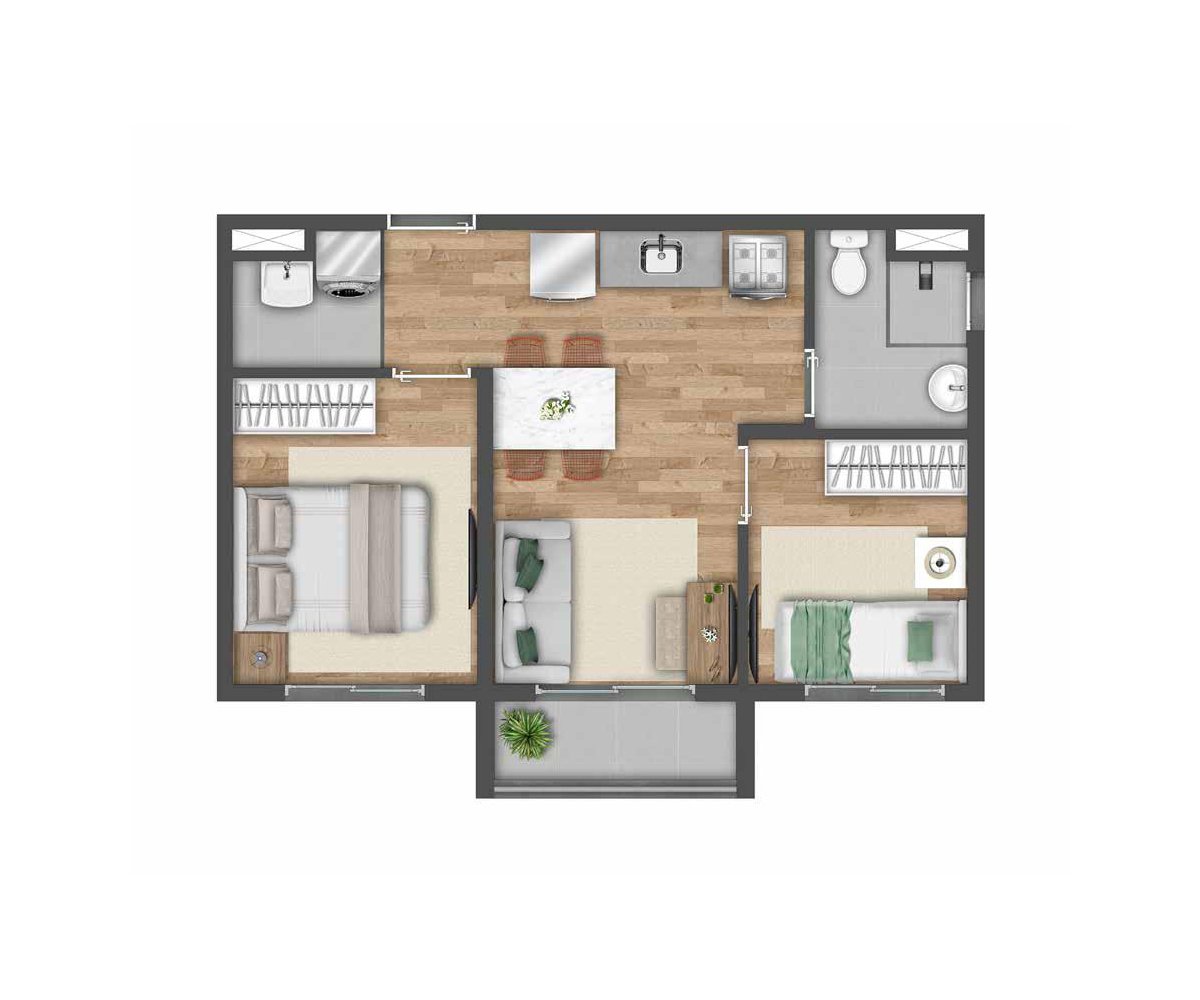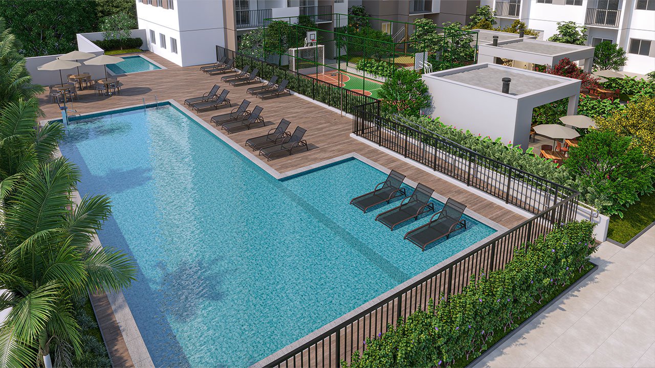 Um condomínio com apartamentos de 1 e 2 dormitórios, em plantas de 26m² à 44m². Mais de 15 itens de lazer para toda a família.